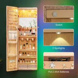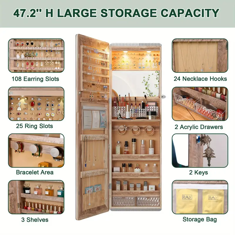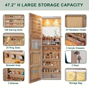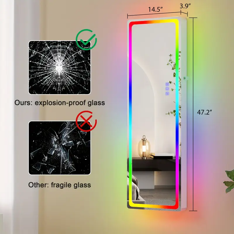 HNEBC LED Mirror Jewelry Cabinet with RGB Lights, 47.2" Wall-Mounted Wooden Armoire Organizer, Full-Length Mirror, 2 Drawers, Lockable Storage for Bedroom & Bathroom, Contemporary Design, White Hardwood Finish quantity